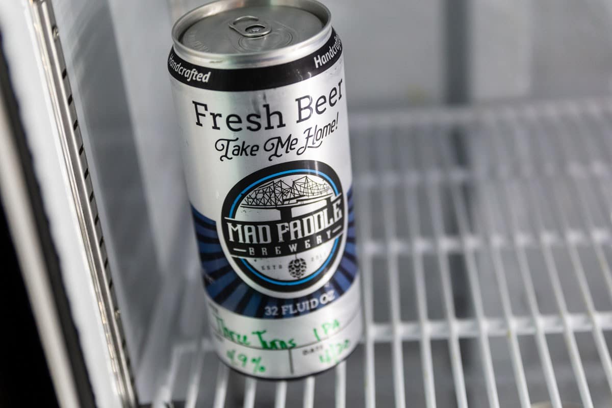 We sell 32 oz Crowlers of all of our Mad Paddle Beers that are on tap at Mad Paddle Brewery.